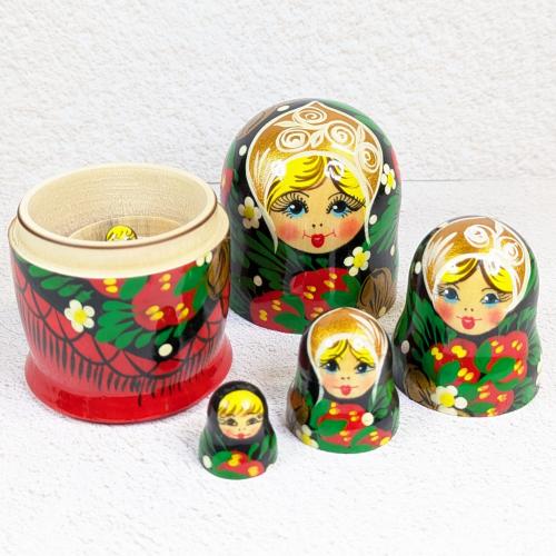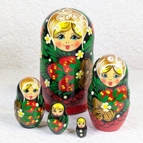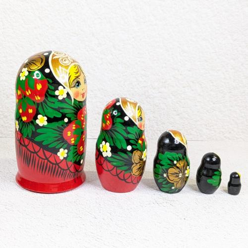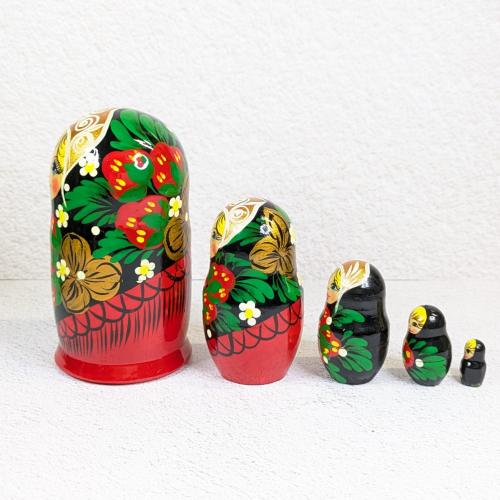 【ロシア】女の子マトリョーシカ・5個型中(黒赤イチゴ)