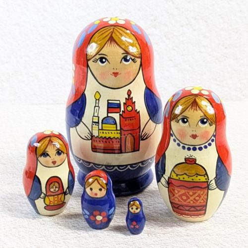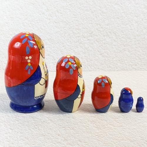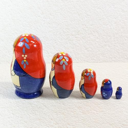ロシアの国旗にも使われる『スラブ3原色』をベースに描かれた、女のコ柄の5個型マトリョーシカ。
