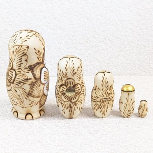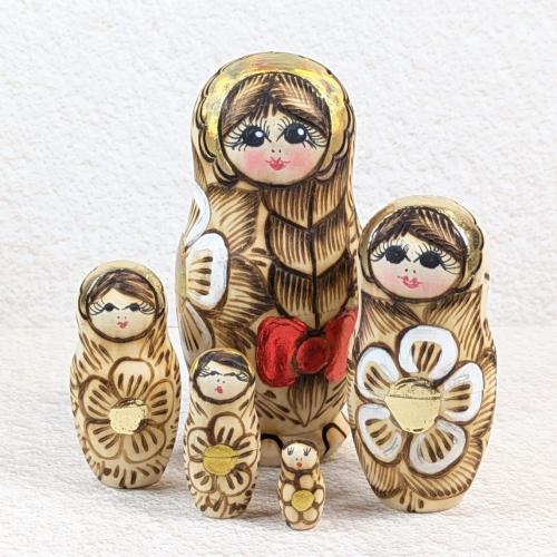 【ロシア】マトリョーシカ・5個型中 ニス無し白木(おさげ赤リボン)