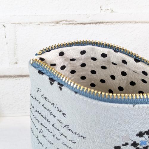 ブルーグレー地に黒のフランス語とボタニカル柄がプリントされている綿麻生地