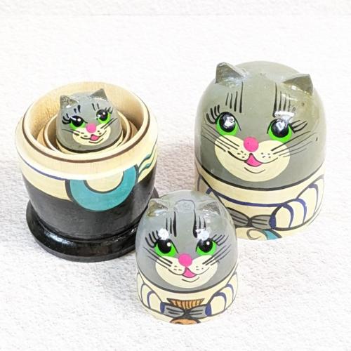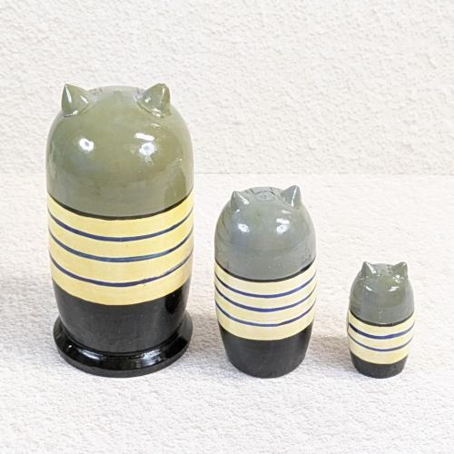 【ロシア】動物モチーフ耳つきマトリョーシカ・3個型(ネコ/ボーダー)