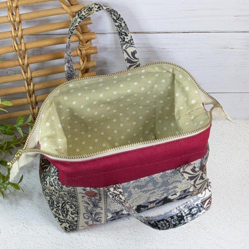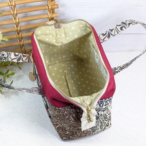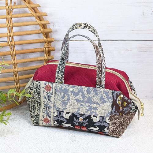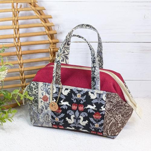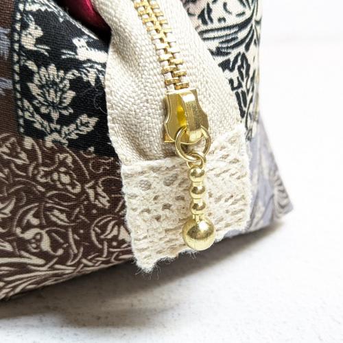 ウサギやリスなどの動物や花などのパネル柄をパッチワーク風にデザインしたシーチング生地がメイン。全体にシックなイメージのポーチです。