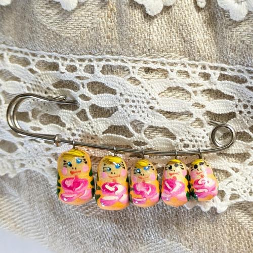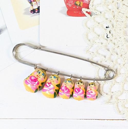 ころんとしたマトリョーシカ型の木製チャームが5サイズ並ぶブローチ。ロシアのお土産品としても人気アイテムなのだとか。