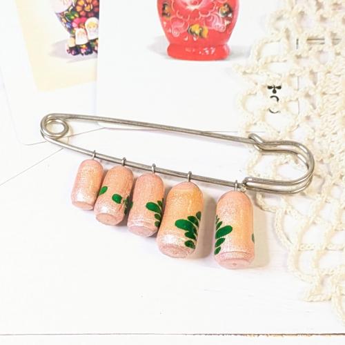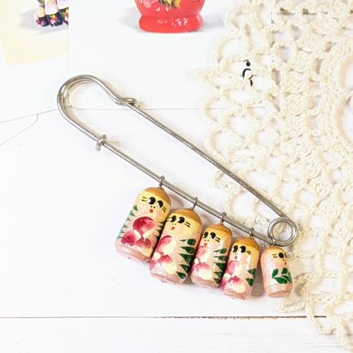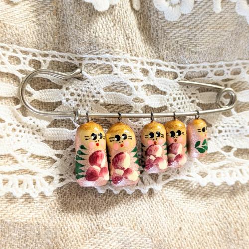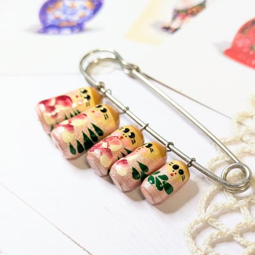 ころんとしたマトリョーシカ型の木製チャームが5体並ぶブローチ。ロシアのお土産品としても人気アイテムなのだとか。