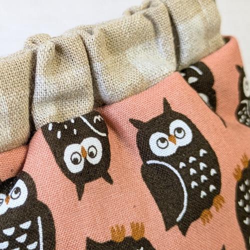 くすみピンク地にフクロウモチーフのプリント