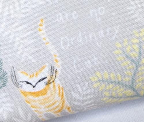 淡いグレーの地に優しい色の猫と植物のイラストがプリントがプリントされている生地。