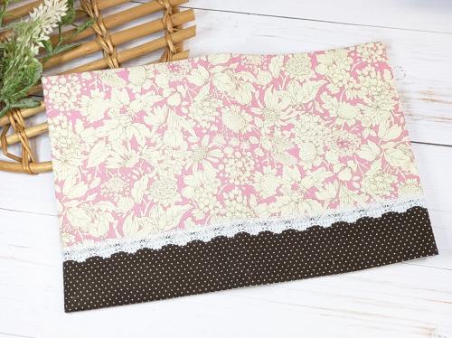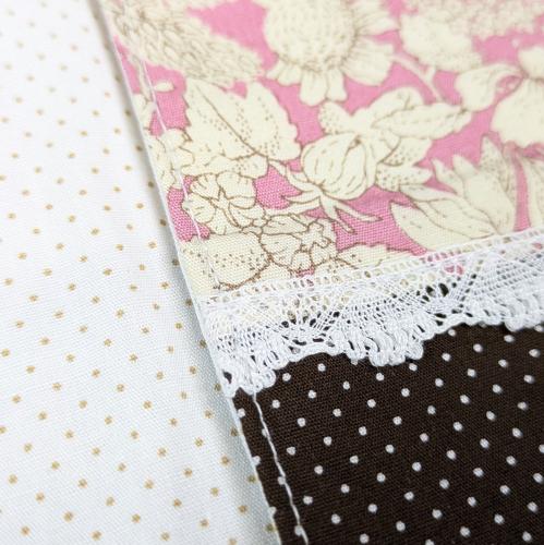 表側はメインの柄/レーステープ/ピンドット柄(焦げ茶色地に白)の切り替えデザインになっています。