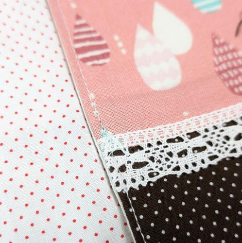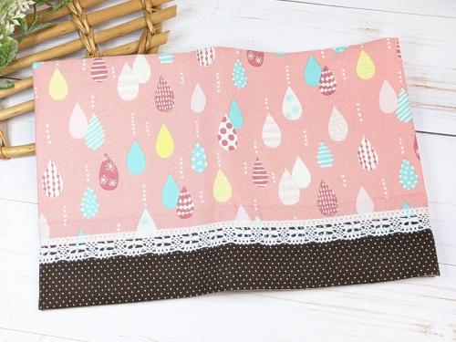 ピンク色のシーチング地にカラフルなレインドロップ柄がプリントされたメインの生地/レーステープ/ピンドット柄(焦げ茶色地に白)生地の切り替えデザインになっています。