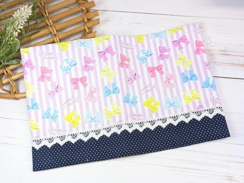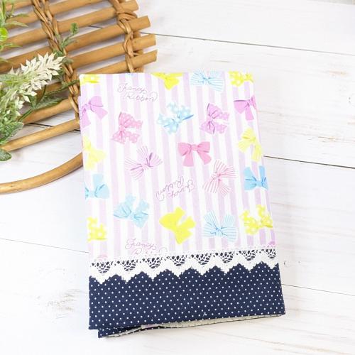 シーチング地にカラフルなリボンとパープルのストライプ柄がプリントされたメインの生地/レーステープ/ピンドット柄(紺地に白)生地の切り替えデザインになっています。